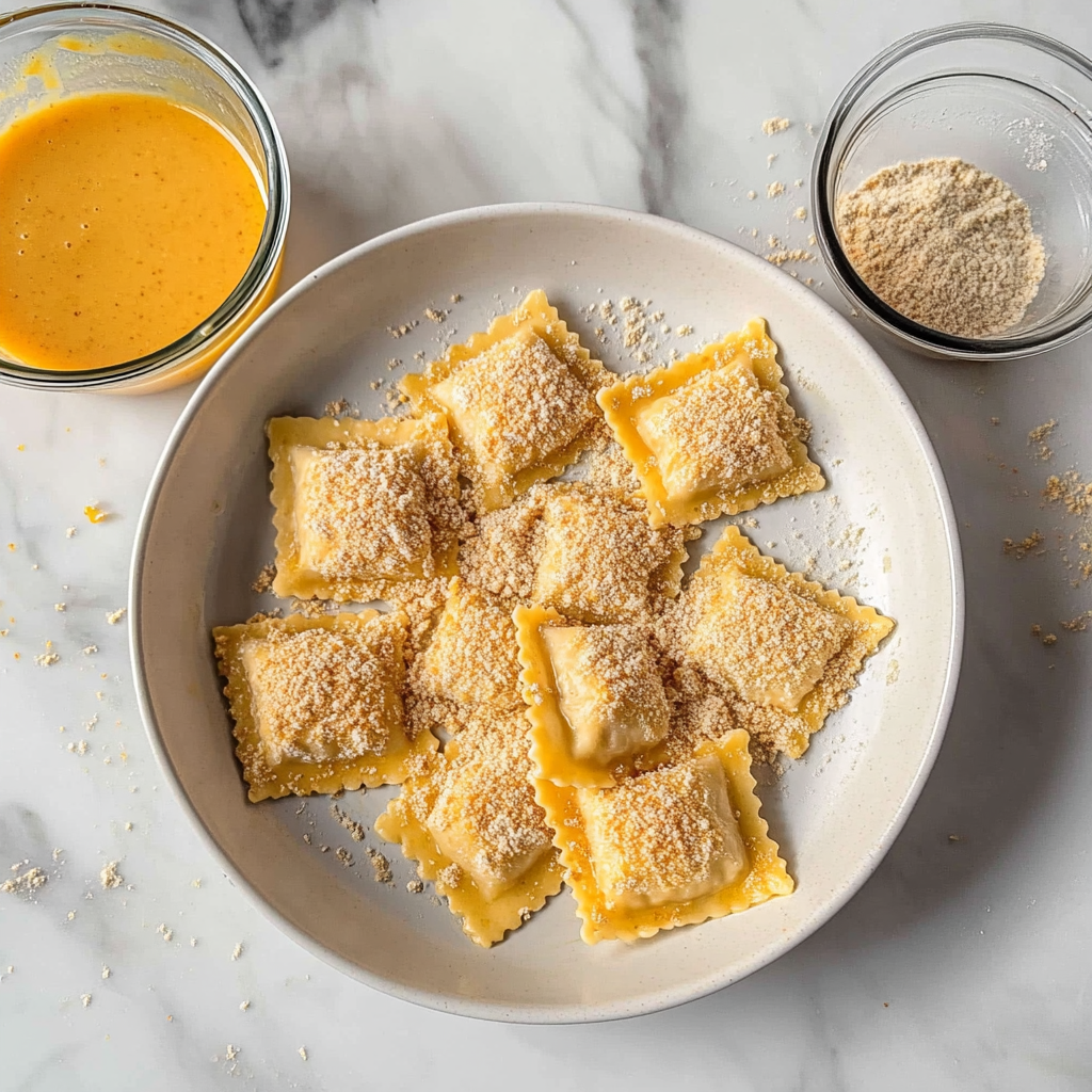 Season Your Ravioli: Sprinkle salt and pepper over the coated ravioli. Don’t be shy; season generously for maximum flavor!
