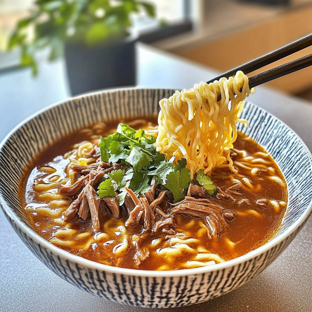 This birria ramen with tender beef and rich broth delivers warmth and excitement in every bite.